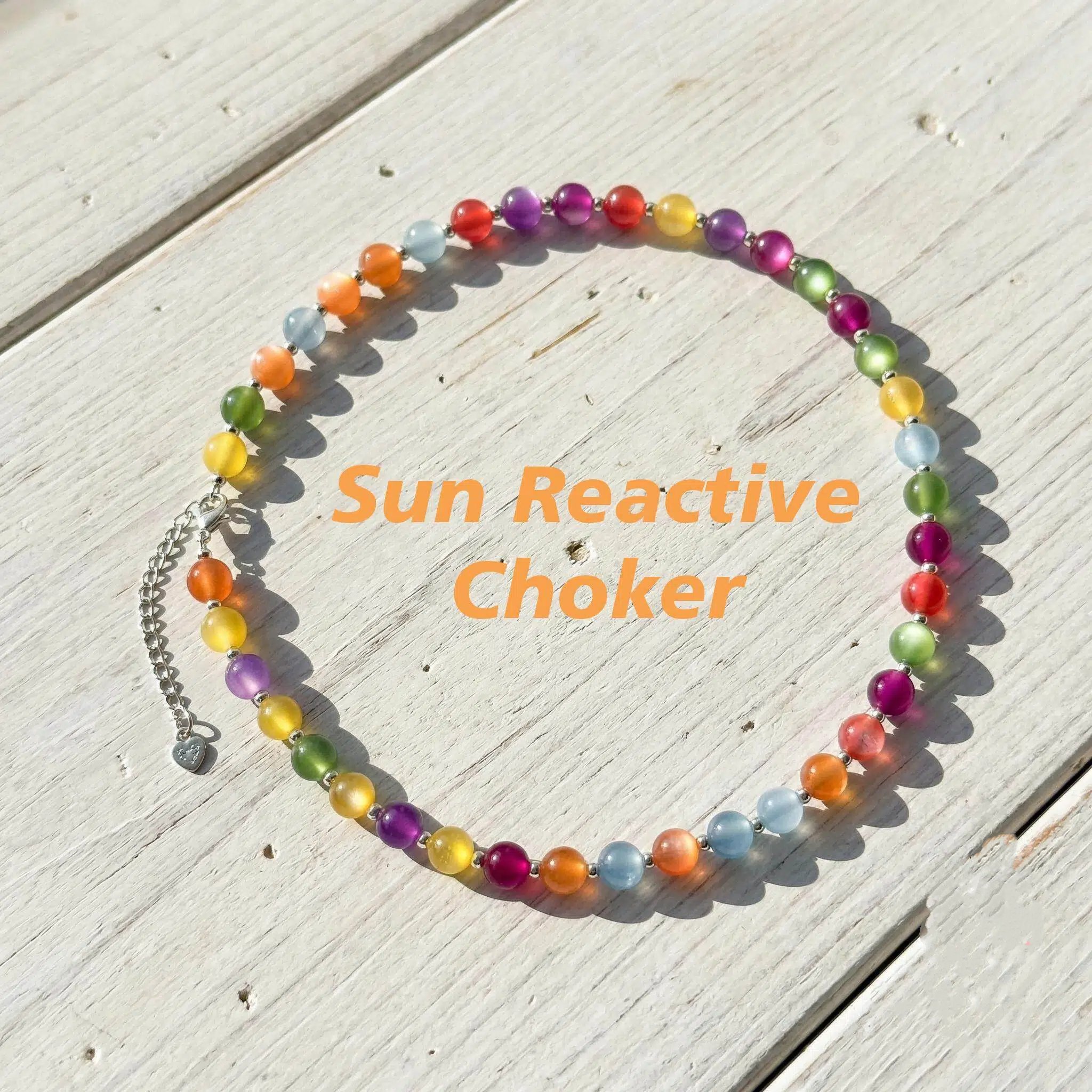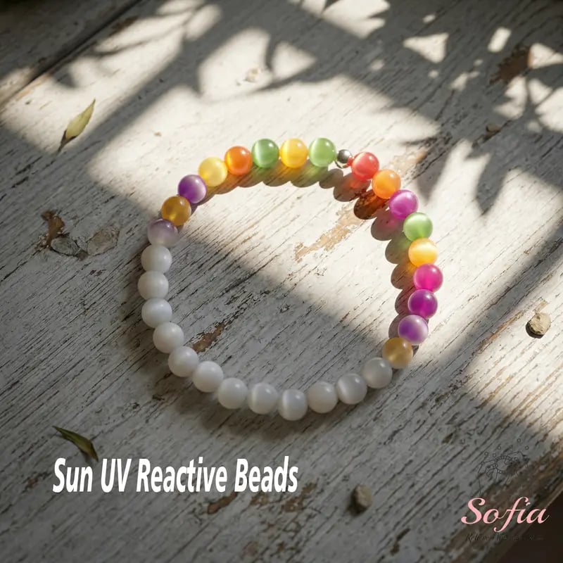 🌈 The beads contain UV‑sensitive pigment. Indoors (no UV), they appear frosted white/clear. In direct sunlight (UV present), they turn into a rainbow spectrum. On cloudy days, the effect is softer pastel.