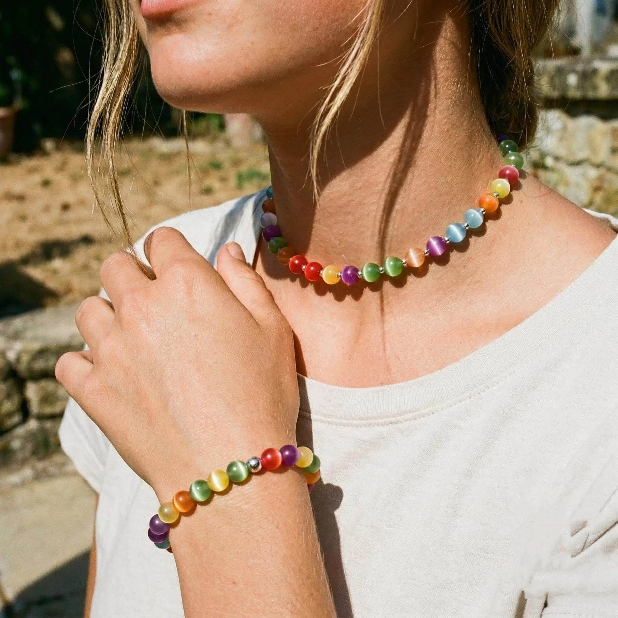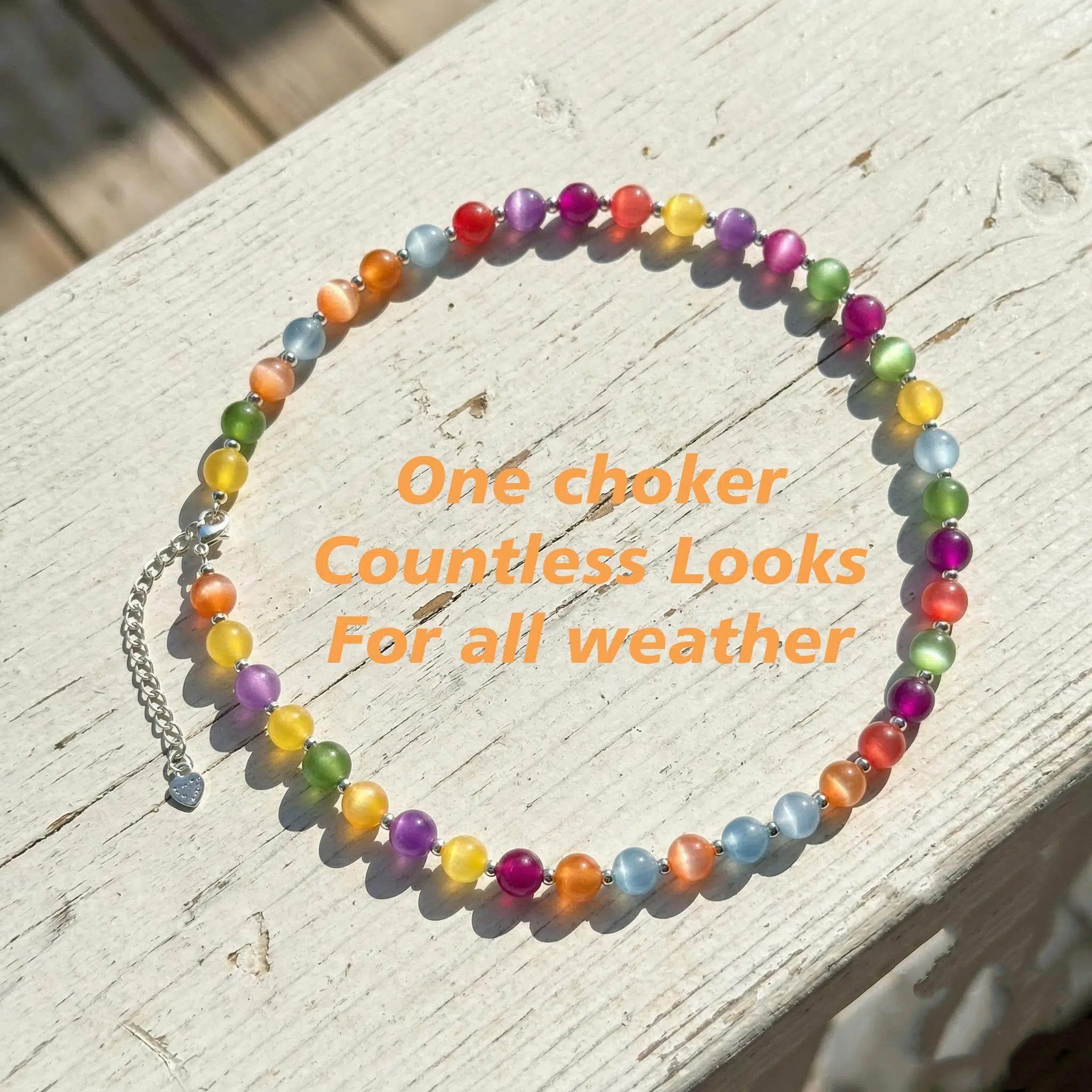 Layer it with gold chains, pearl chokers, or other beaded necklaces. The simple frosted look blends with everything, while the rainbow surprise makes it a conversation starter.